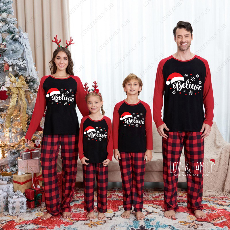 Believe Christmas Family Pajamas Red Black Plaid Matching PJs Sets
