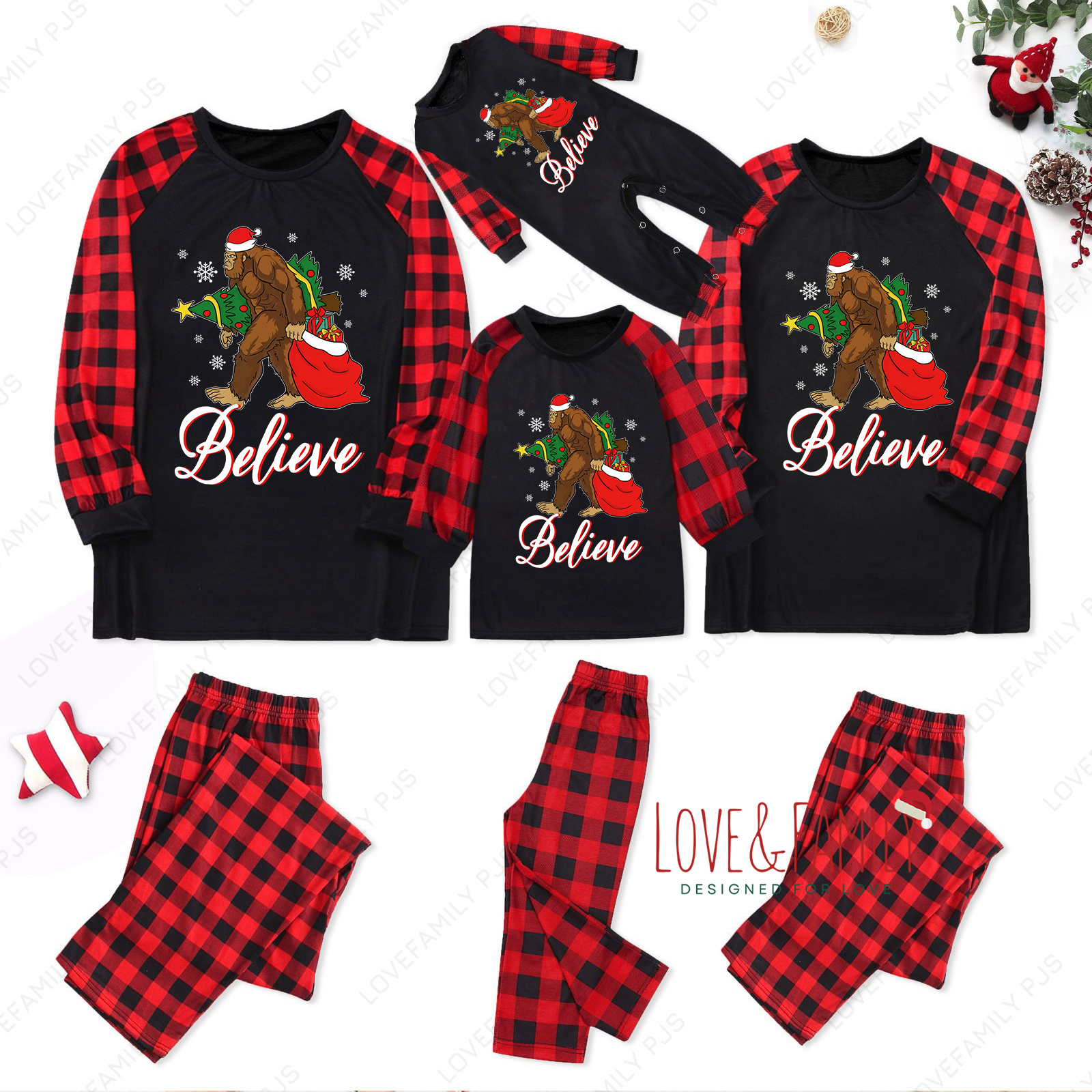 Believe Print Bigfoot Red Plaid Splice Christmas Family Pajamas