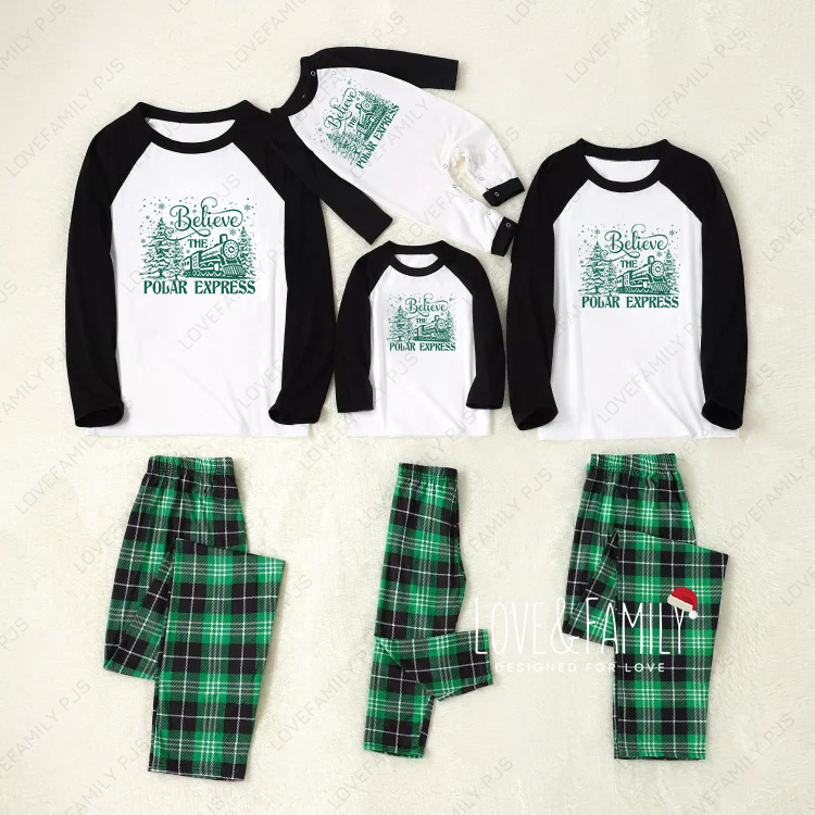 Believe The Polar Express Christmas Family Pajamas Green Plaid PJs Set