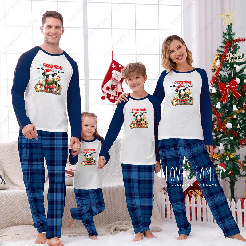 Christmas Cow On The Farm Family Matching Pajamas Blue Plaid PJs Sets