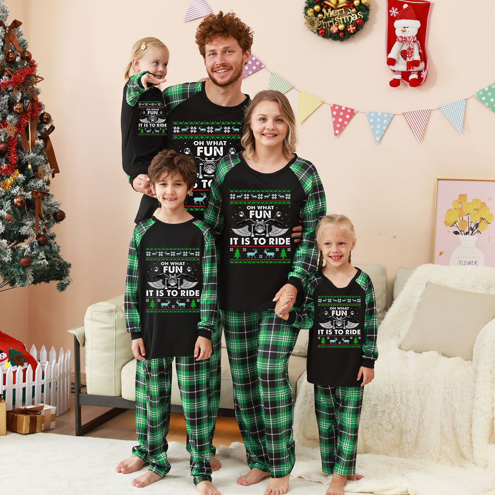 Christmas Family Matching Pajamas Green Plaid Motorcycle PJs Sets