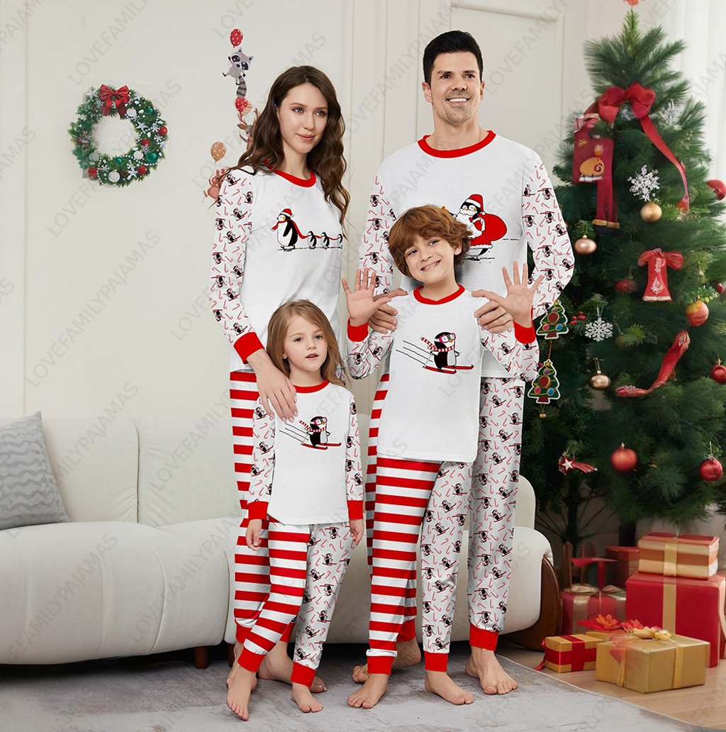 Christmas Family Pajamas Penguin Print Stripes Pant Holiday PJs Sets