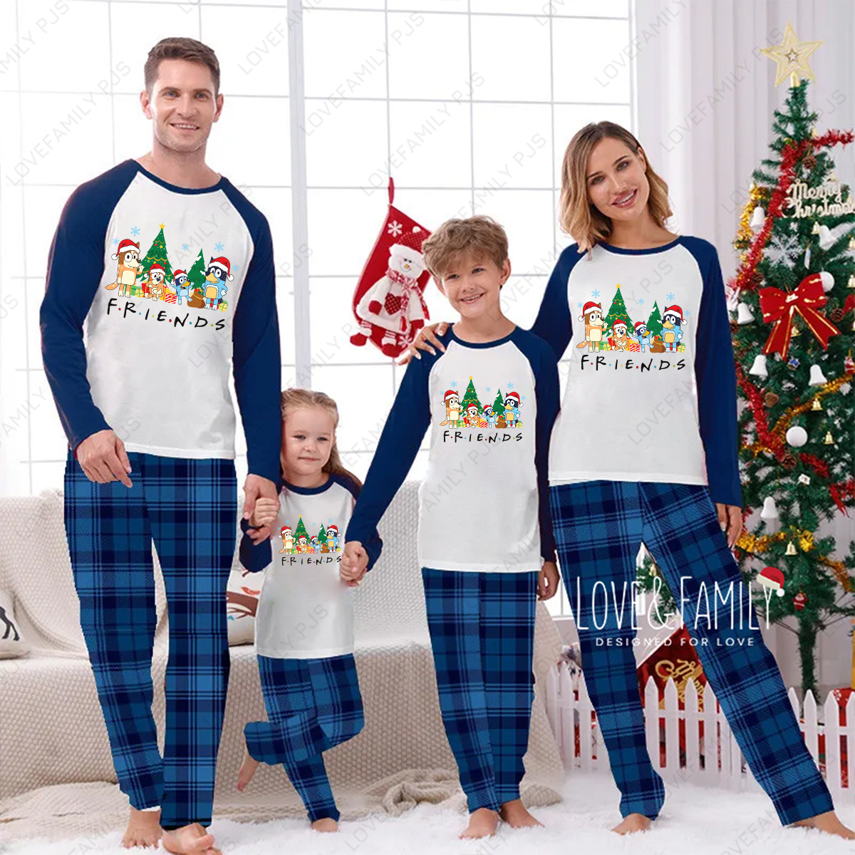 Christmas Friends Bluey Family Matching Blue Plaid Pajamas Set
