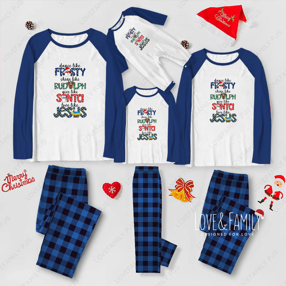 Christmas Pajamas Dance Like Frosty, Love Like Jesus Blue Plaid Family PJs Sets
