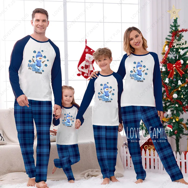 Christmas Snowman Baby It's Cold Outside Family Blue Plaid Matching Pajamas Sets