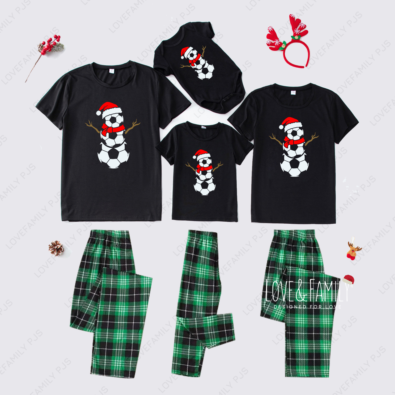 Christmas Soccer Ball Snowman Family Pajamas Short Sleeve Green PJs Sets