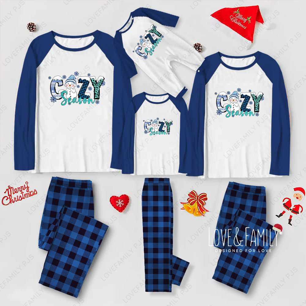 Cozy Season Christmas Snowman Family Blue Plaid Pajamas Sets