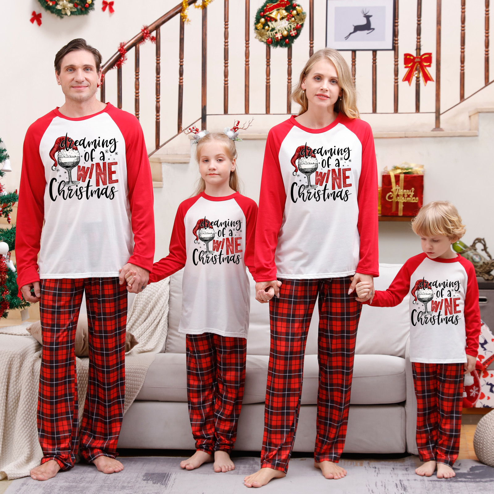 'Dreaming of a Wine Christmas' Red Plaid Family Matching Pajamas Sets