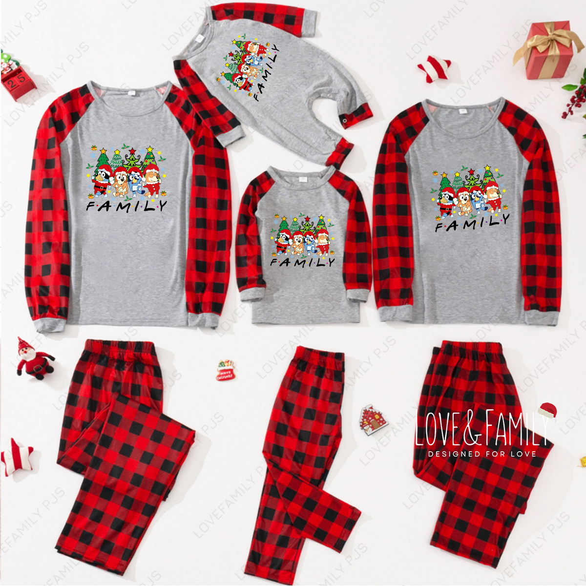 Family Bluey Christmas Buffalo Plaid Family Pajamas Sets(Gray)