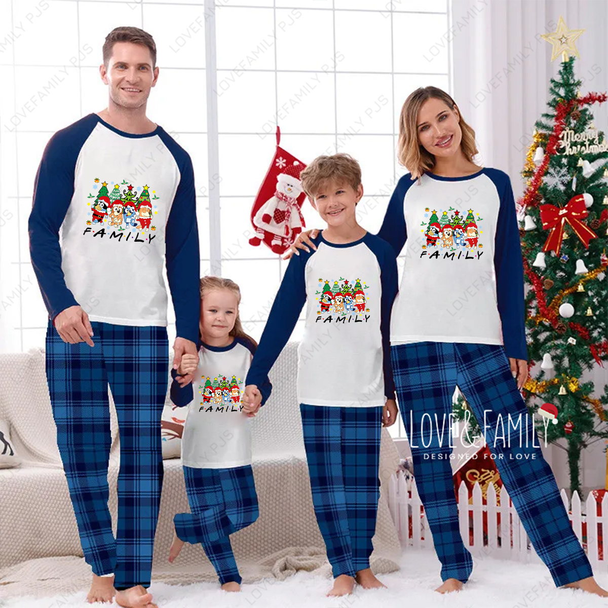 Family Bluey Christmas Matching Blue Plaid Pajamas Set