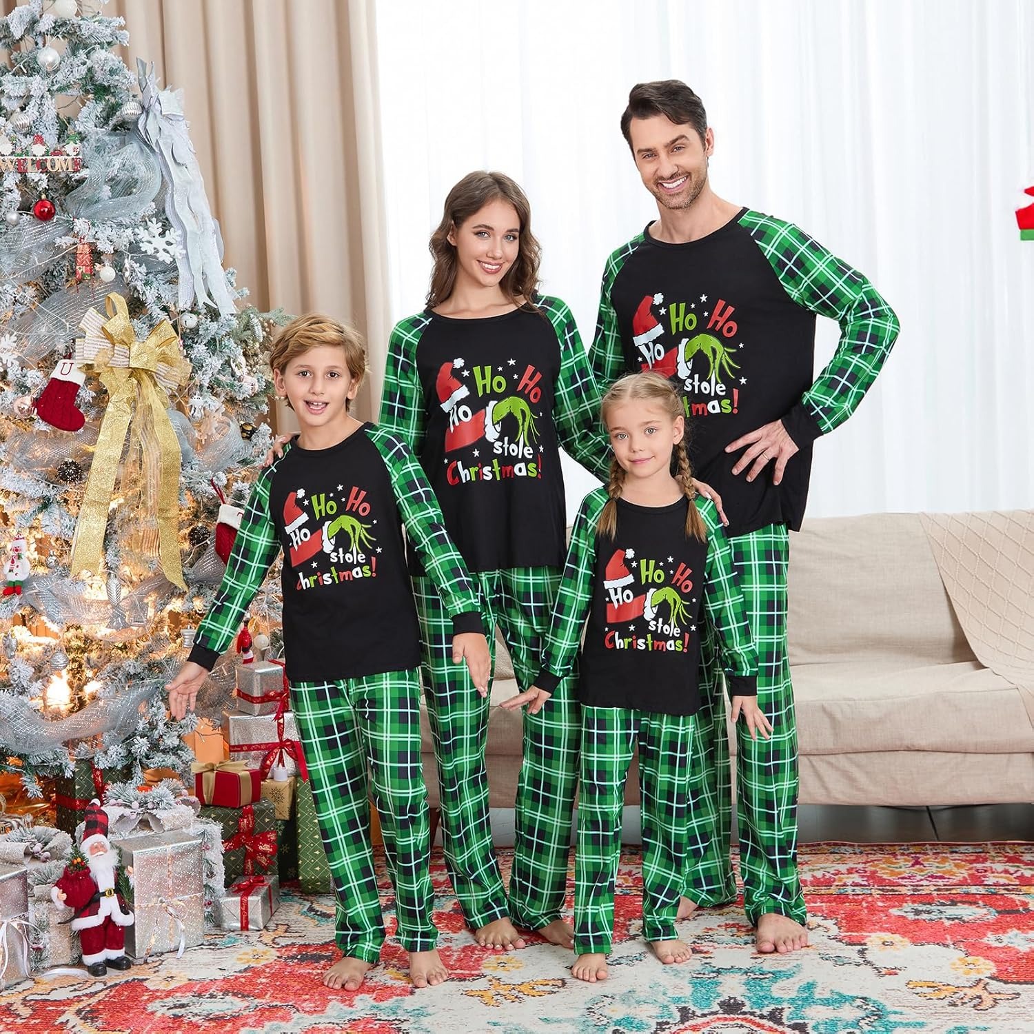 Green Furry Christmas PJs Set Plaid Family Matching Comfy Pajamas