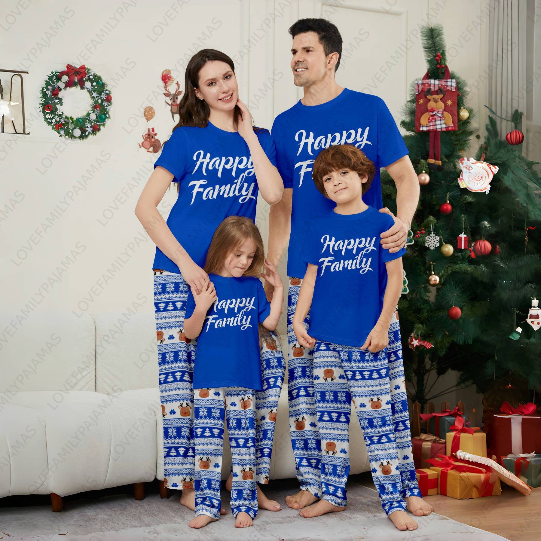 Happy Family Christmas Matching Blue Short-sleeve Pajamas Sets
