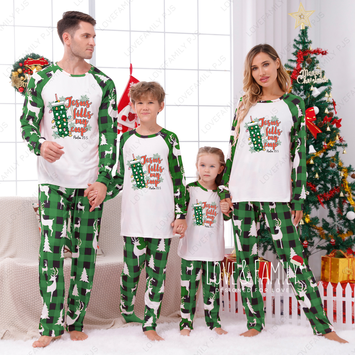 Jesus Fills My Cup Christmas Family Green Pajamas Sets