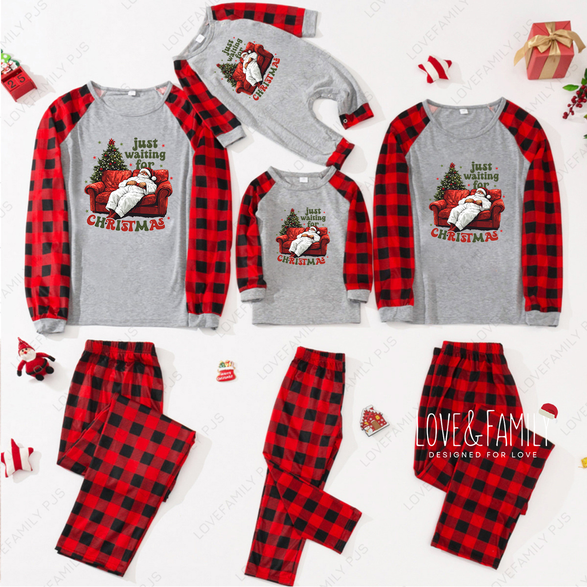Just Waiting For Christmas Santa Family Matching Buffalo Pajamas Sets(Gray)