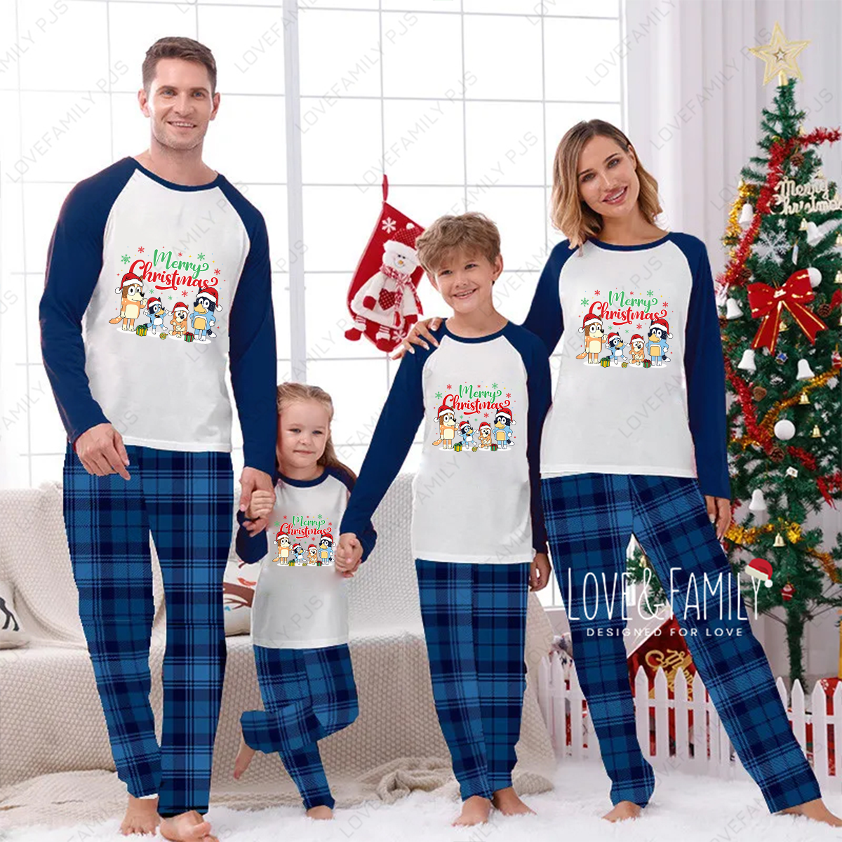 Merry Christmas Bluey Family Matching Blue Plaid Pajamas Set