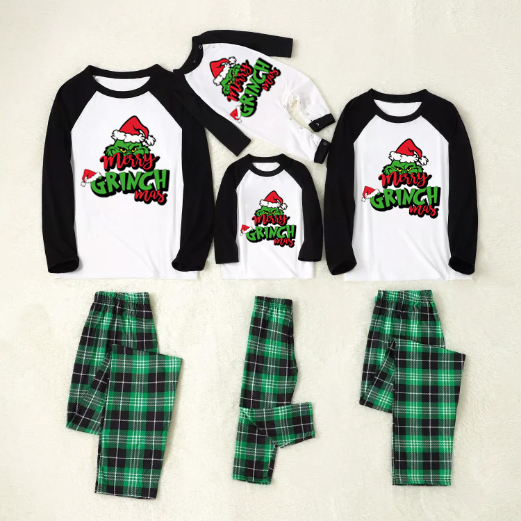 Merry Christmas Cartoon Print Green Plaid Family Matching Pajamas Set