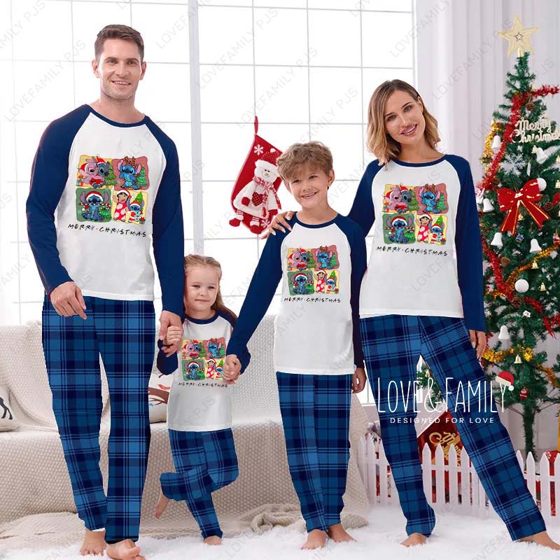 Merry Christmas Disney Stitch Family Blue Plaid Matching Pajamas Sets
