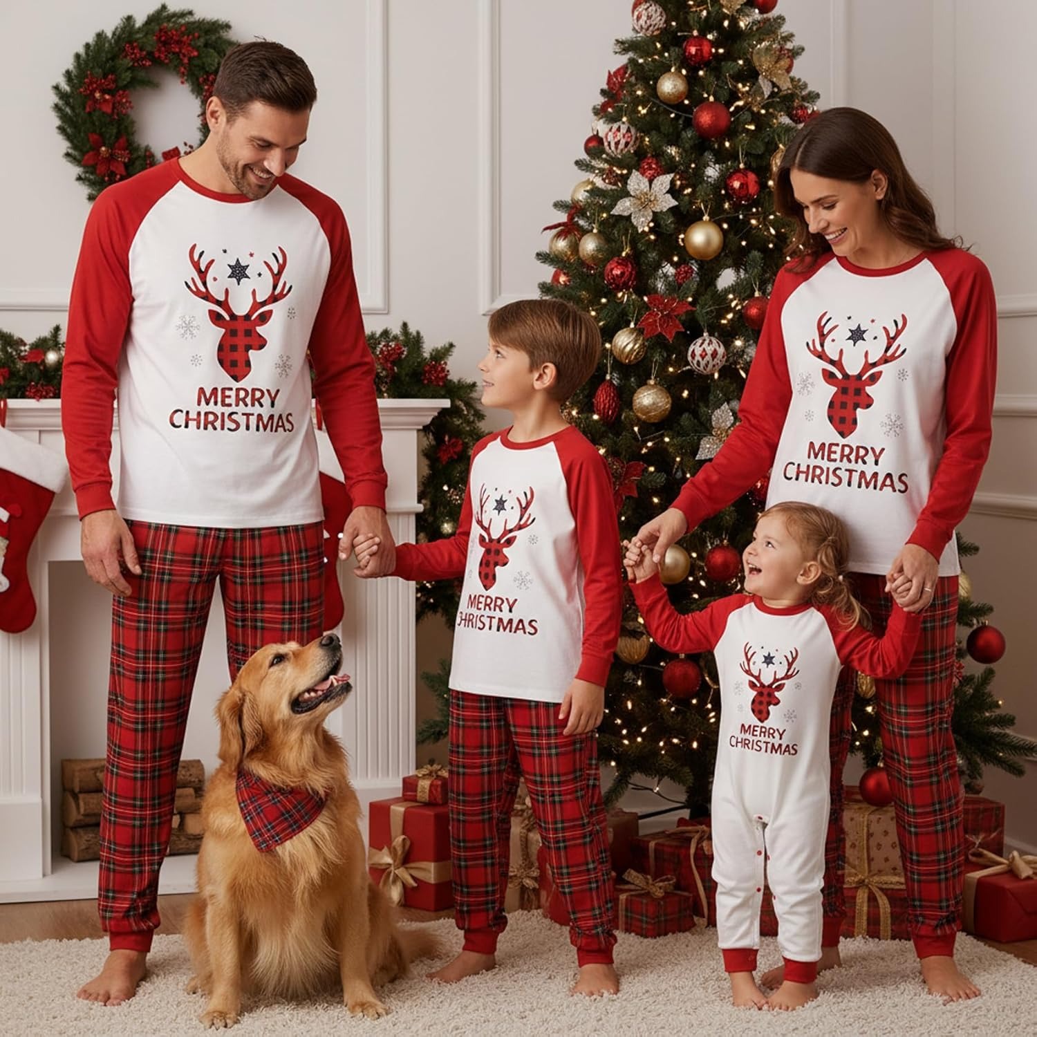 Merry Christmas Reindeer Print Red Plaid Family Matching Pajamas Set