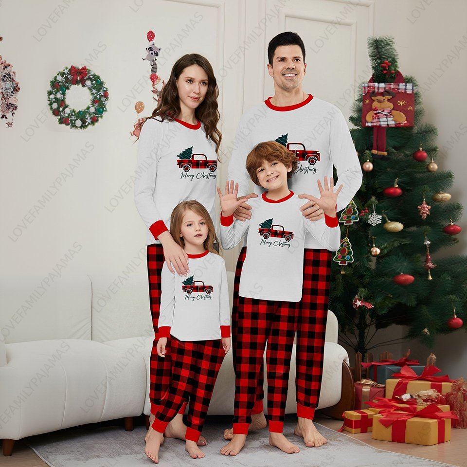 Merry Christmas Truck Print White Top & Red Plaid Pants Family Pajamas Sets