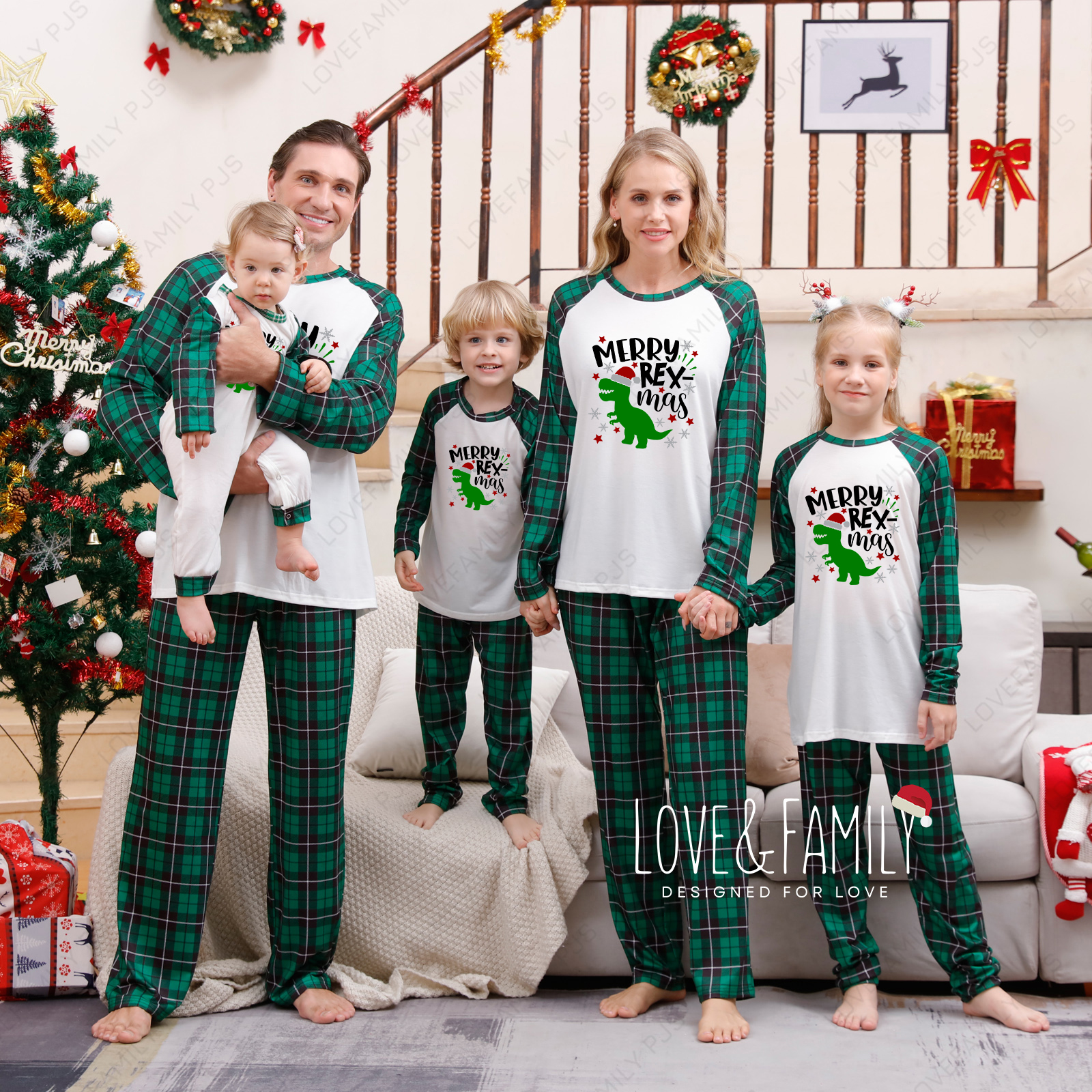 Merry Rex-mas Christmas Dinosaur Family Pajamas Green Plaid PJS