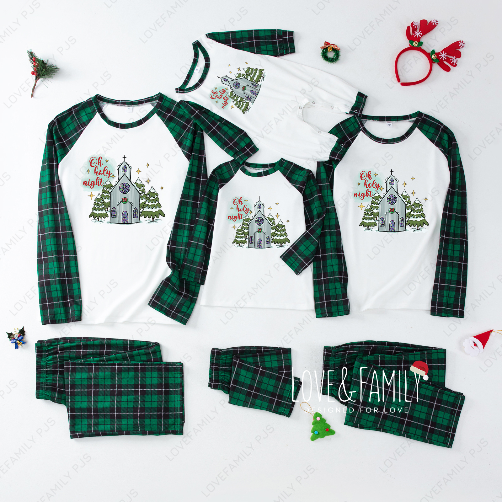 O Holy Night Christmas Green Plaid Matching Pajamas Sets