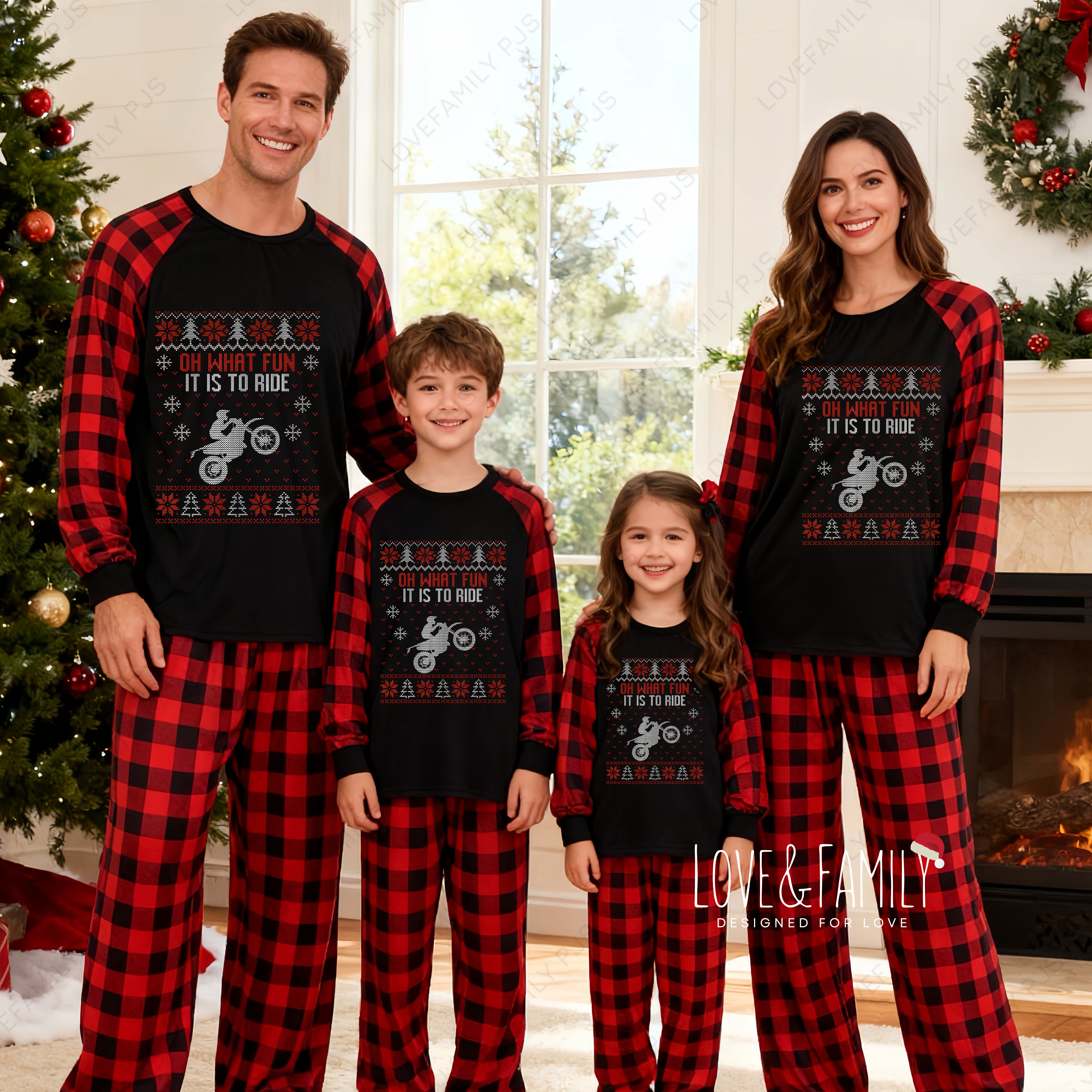 Oh What Fun Cool Motorcycle-Riding Print Red Plaid Christmas Family Matching Pajamas(Black)