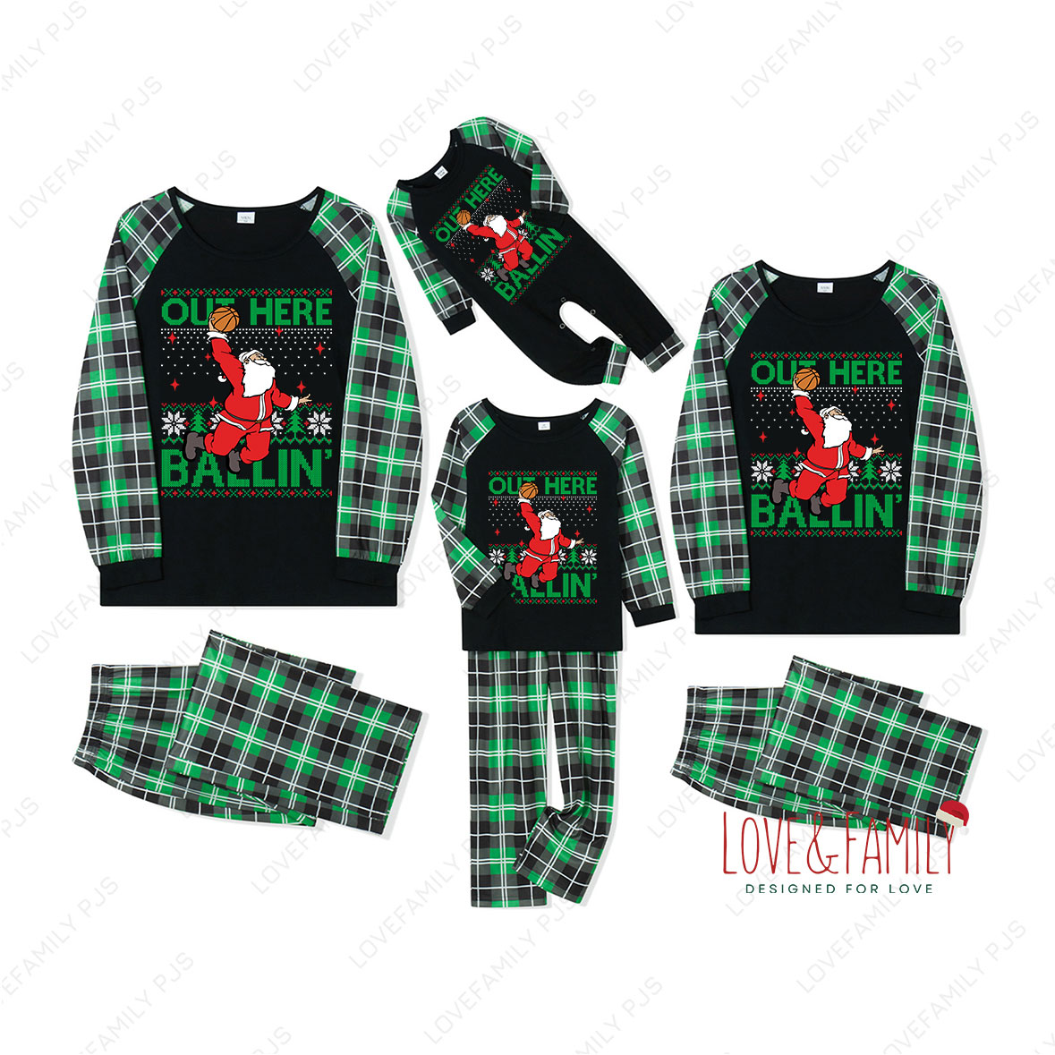 Out Here Ballin' Family Christmas Matching Pajamas with Cute Santa Print(Black)