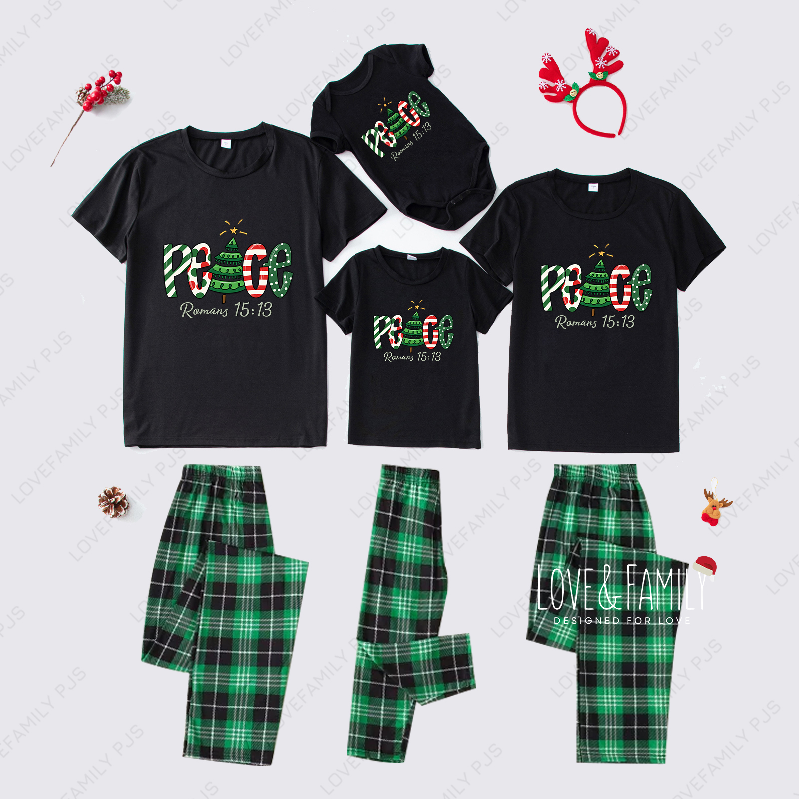 Peace Christmas Family Short Sleeve Green Pajamas Sets
