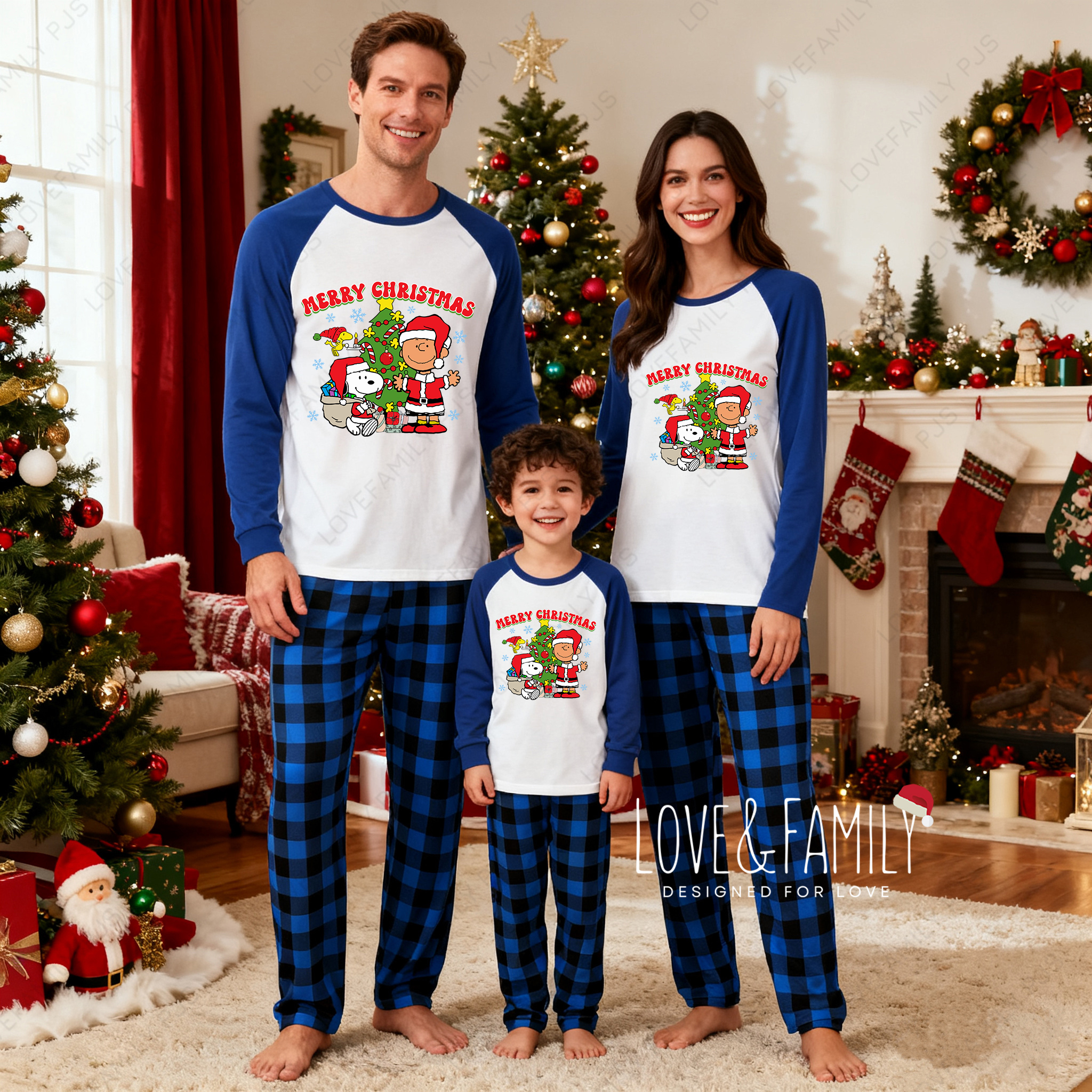 Peanuts Blue Plaid Merry Christmas Family Pajamas Snoopy Holiday PJs Set