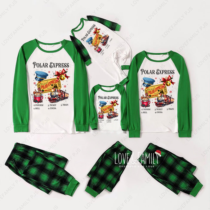 Polar Express Christmas Family Pajamas Green Plaid Matching PJs Set