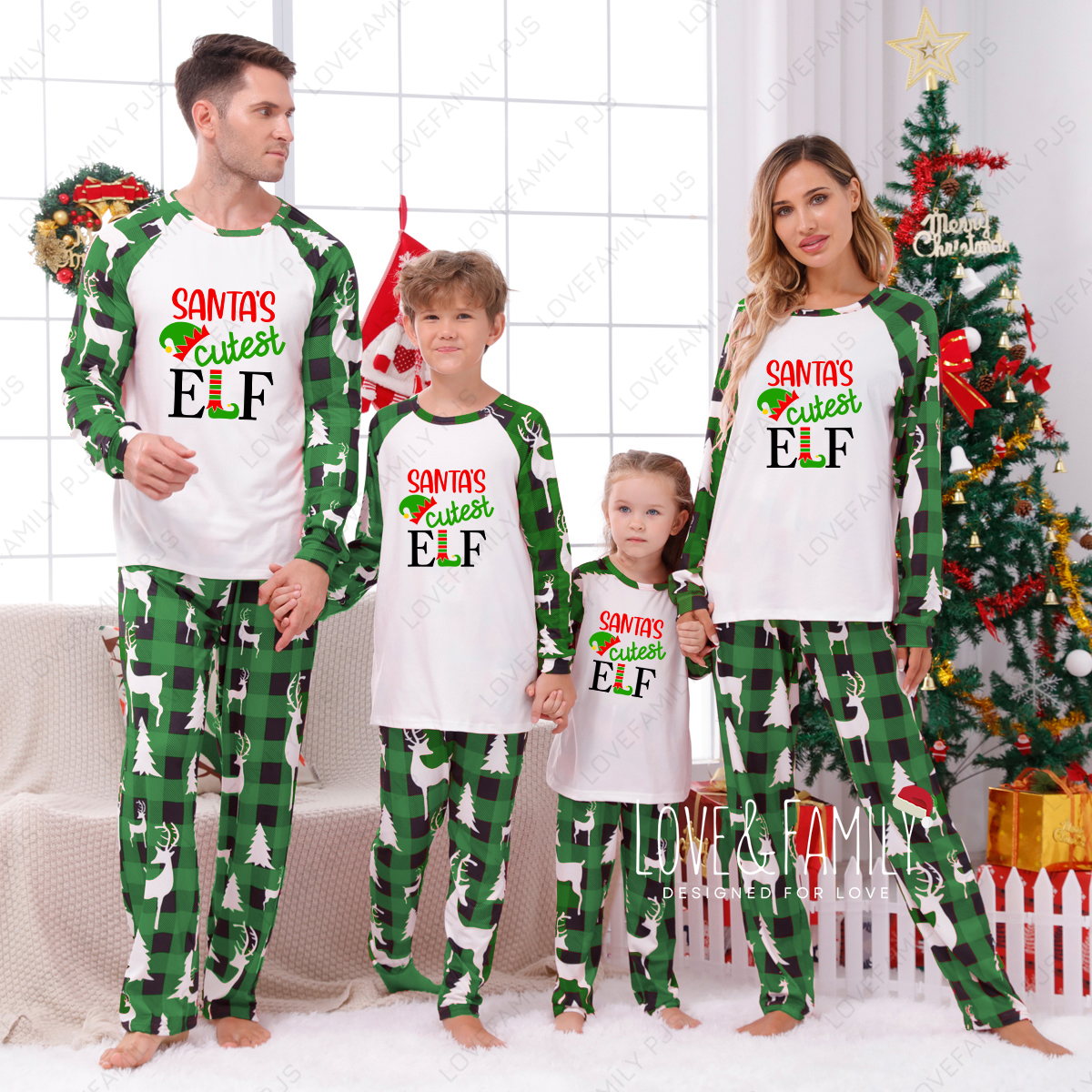 Santa's Cutest Elf Christmas Matching Family Green Pajamas Sets