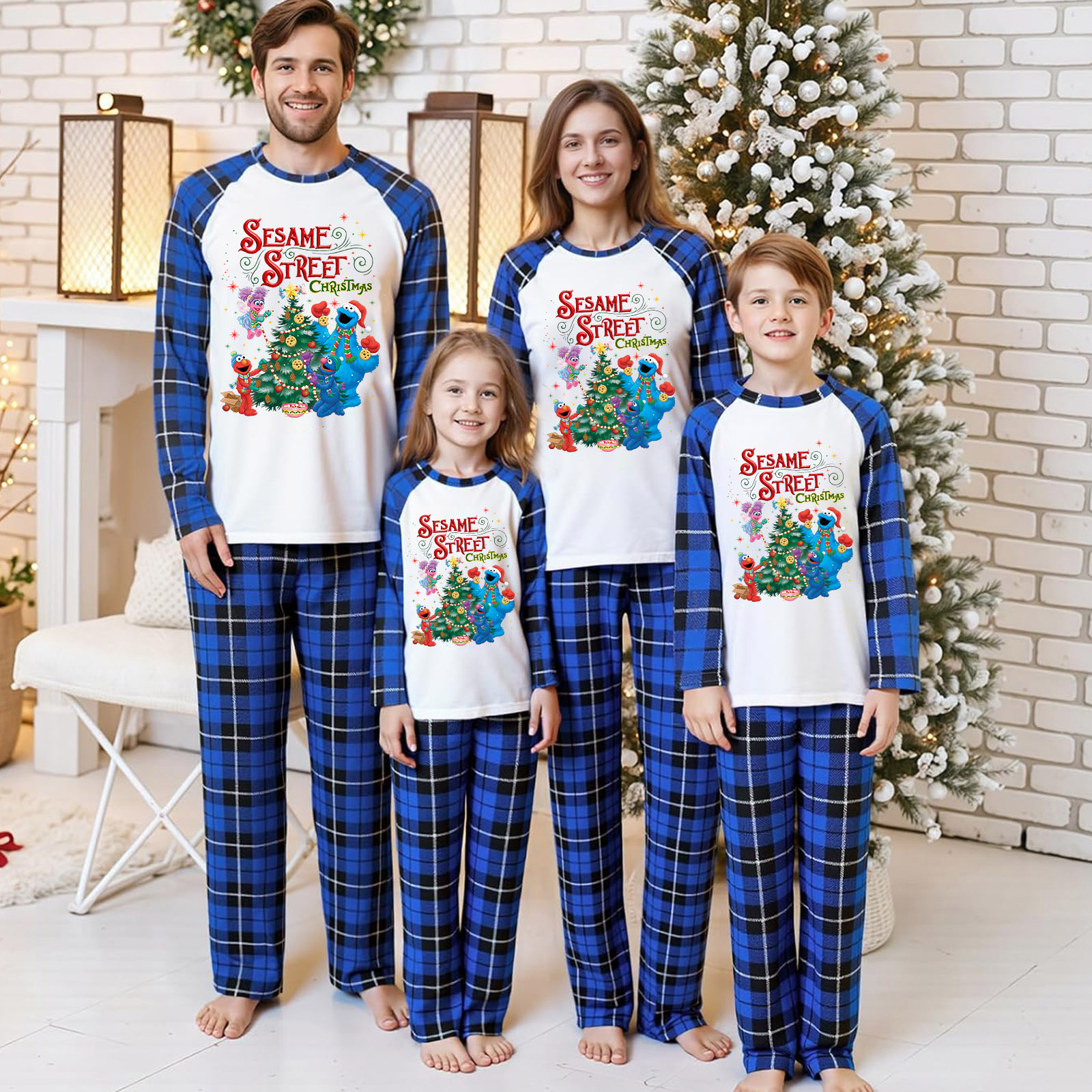 Sesame Street Christmas Family Matching Blue Plaid Pajamas Set