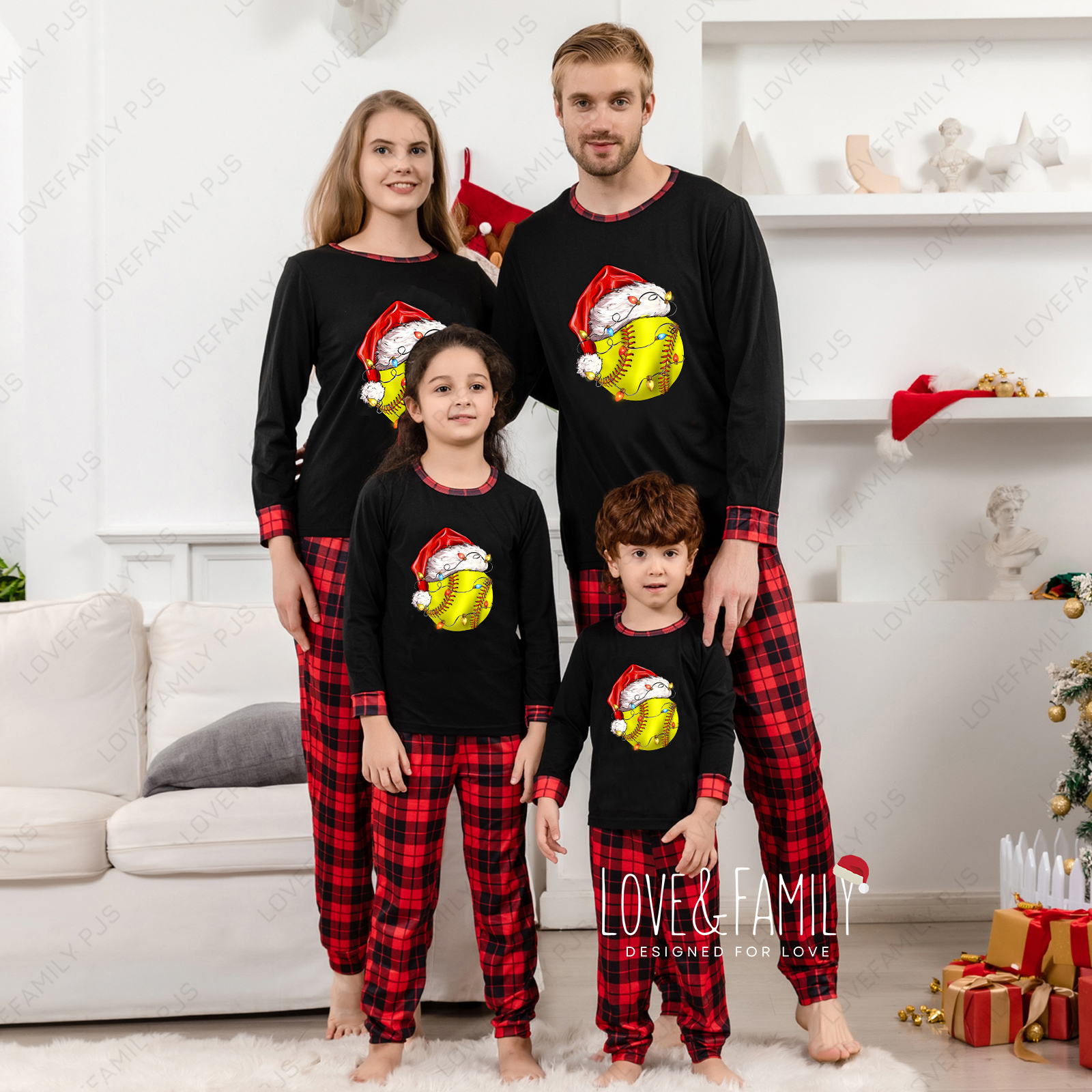 Tennis Ball Christmas Family Matching Red Plaid PJs Sets(Black)