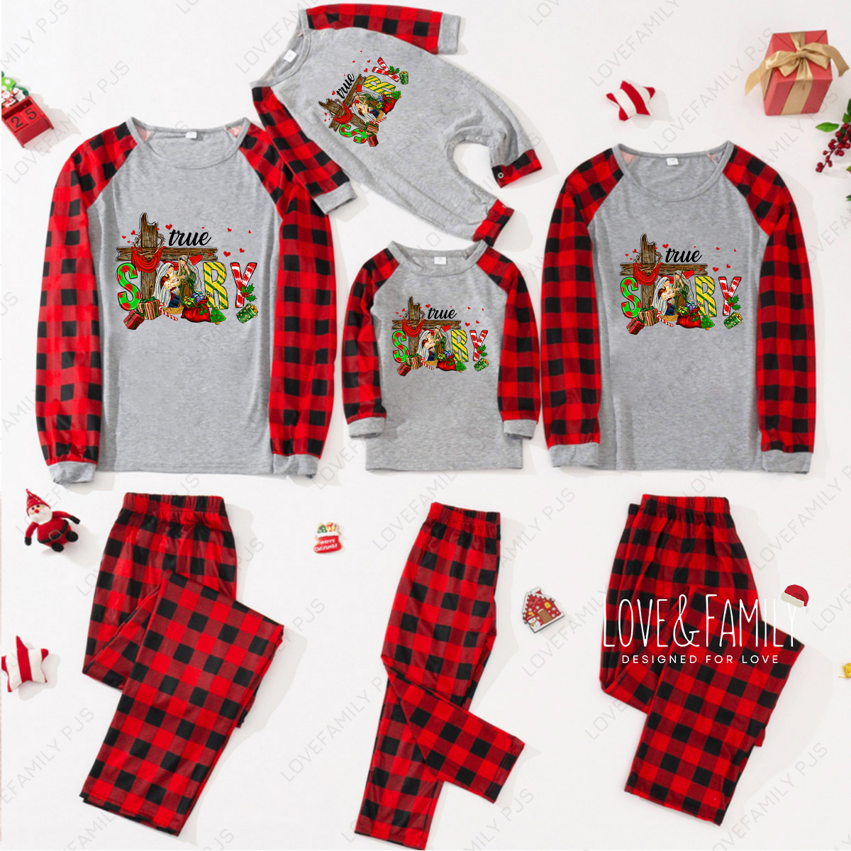 True Story Nativity Family Matching Buffalo Plaid Pajamas(Gray)